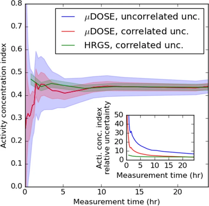 Activity concentration index value uncertainty as a function of measurement time for HRGS (100 g samples) and μDOSE system (3.00 g samples) (from Rocznik et al., 2023)